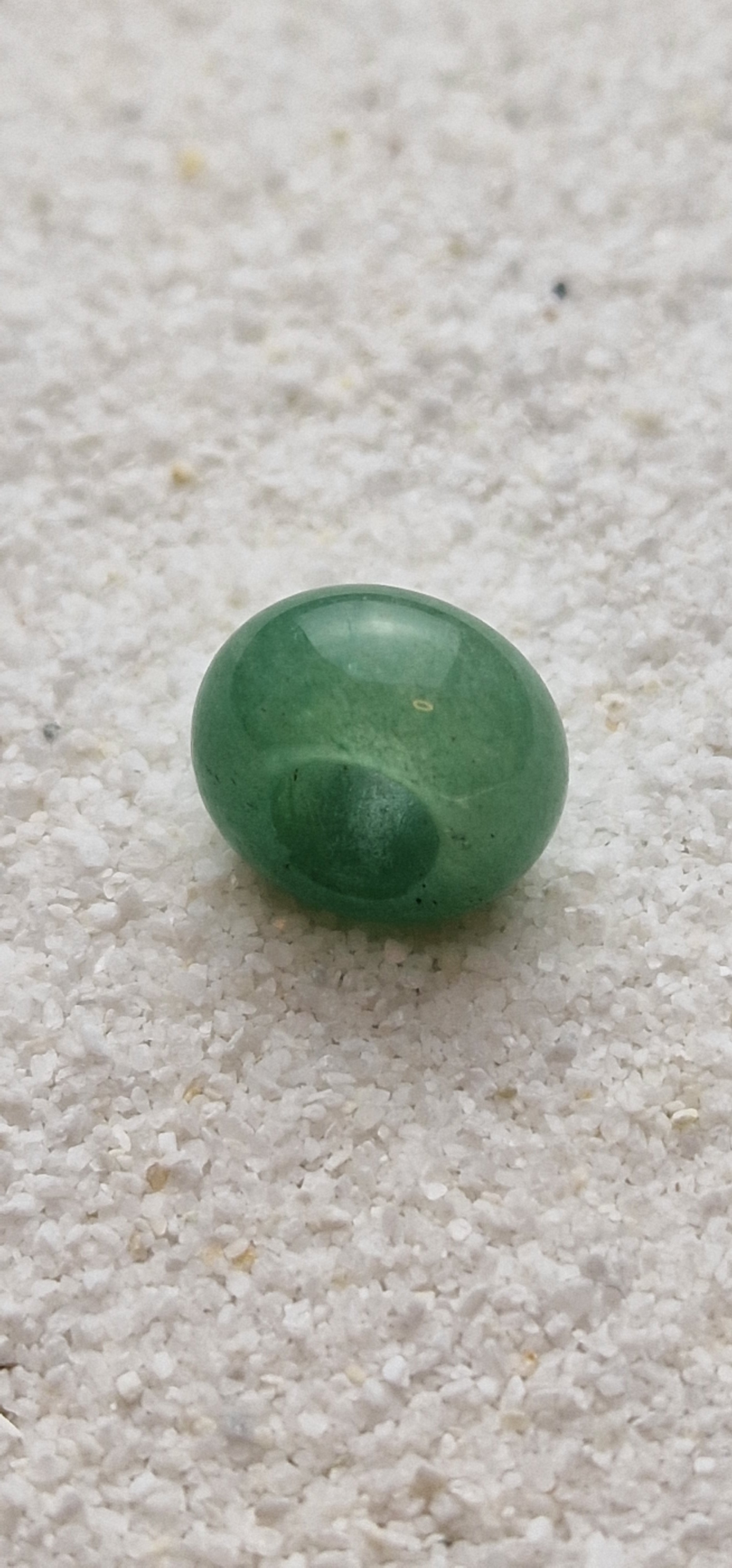 Glatt polierte Perle aus grünem Aventurin, Auswahl mit sehr gleichmäßiger Farbgebung und minimalen Einschlüssen, wolkig und leicht transluszent mit dunkelgrünen Sprenkeln ohne Musterbildungen;