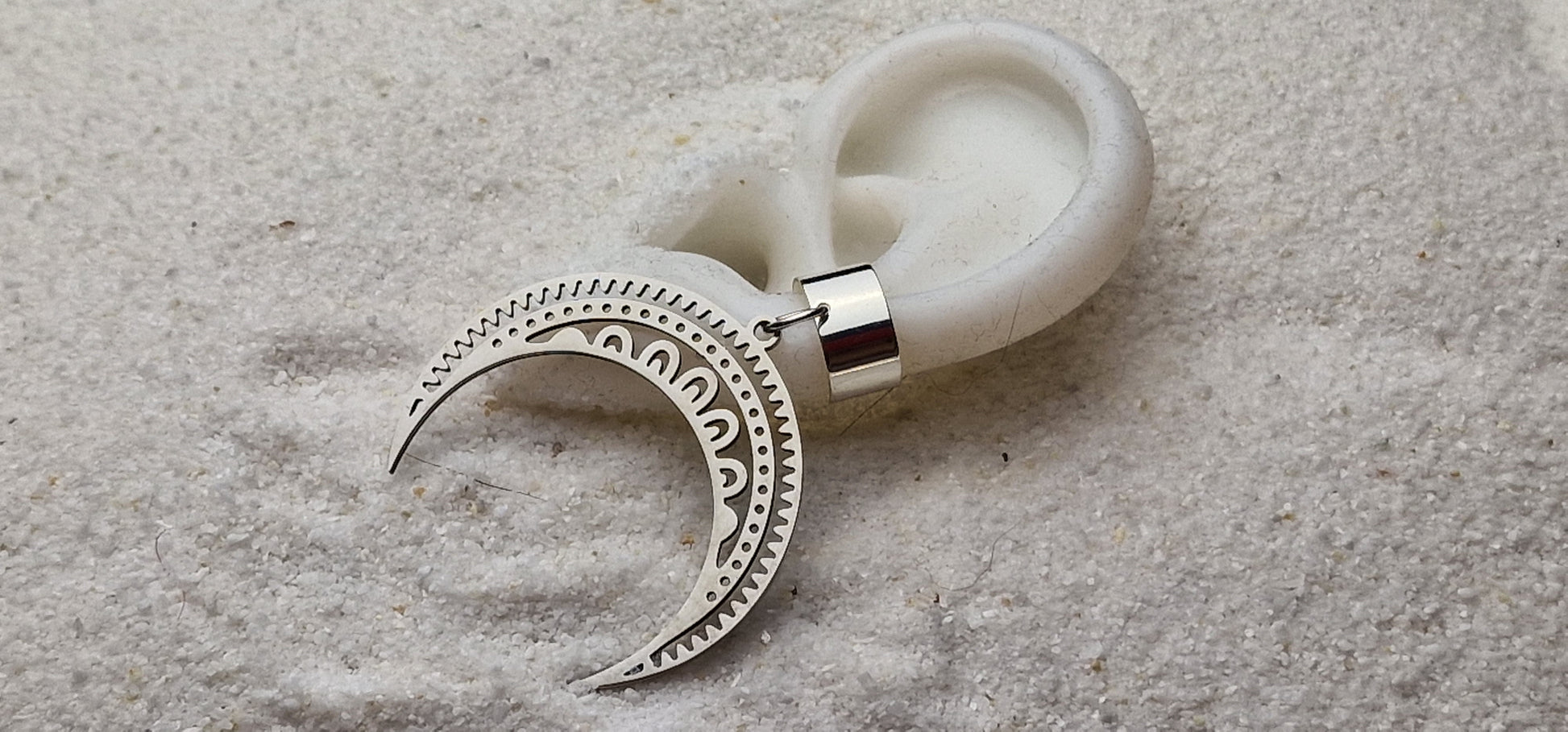 MOON GODDESS / EAR CUFF aus Metall mit großem auffälligem Schmuckanhänger, ausgestanztes Edelstahl Blech, Eye Catcher als Solitär oder im Doppel;
