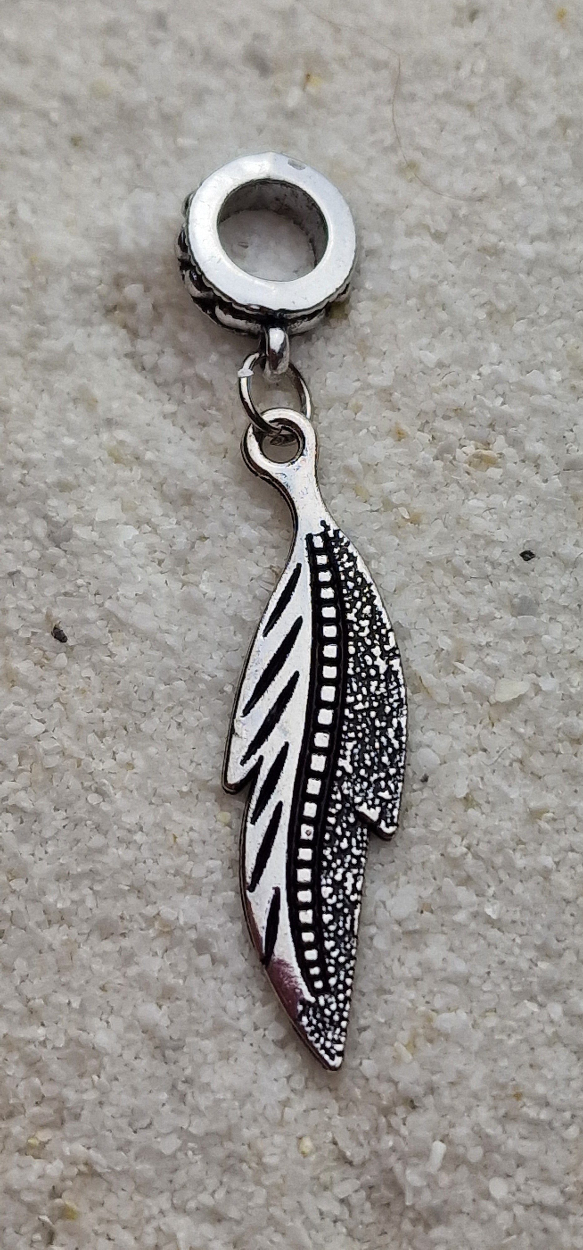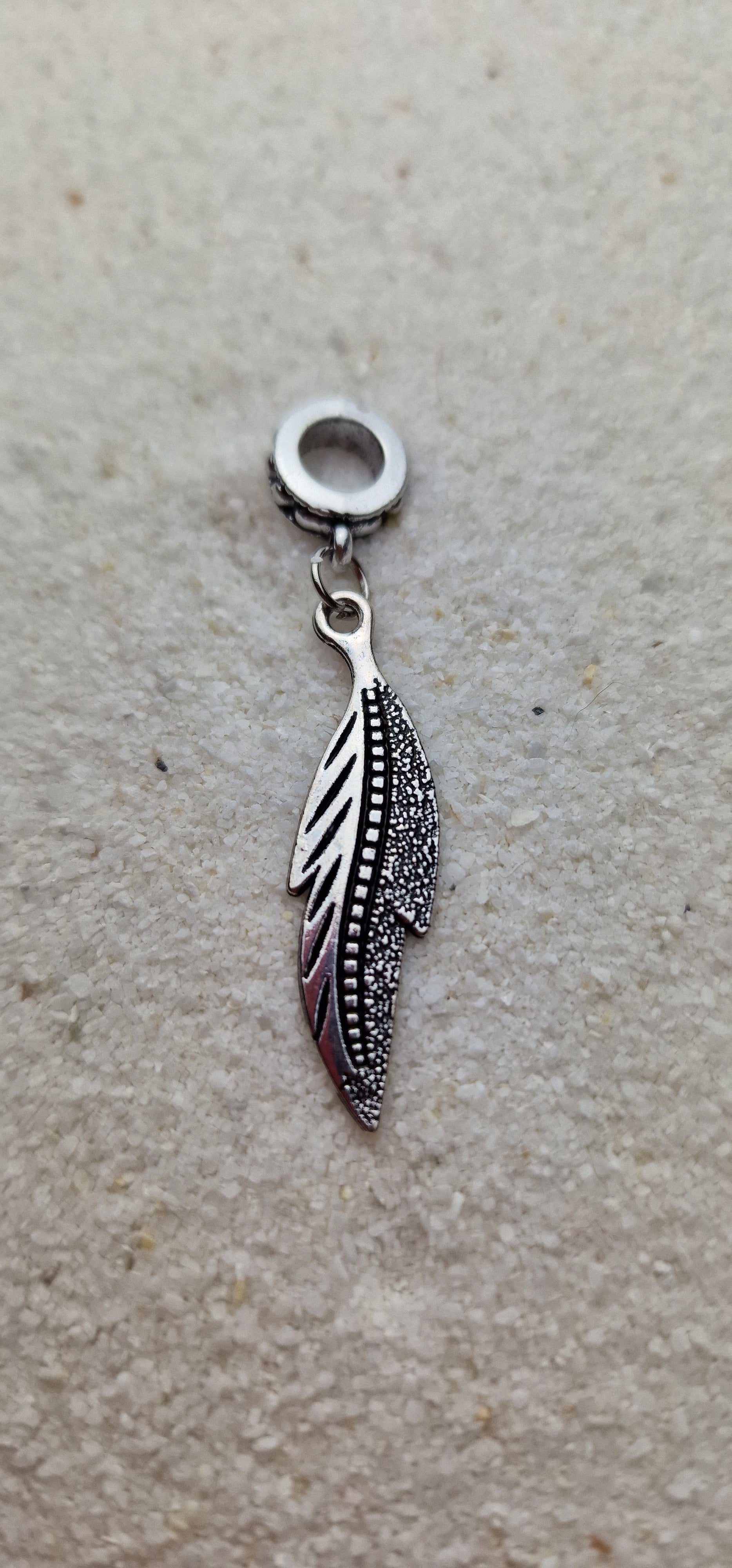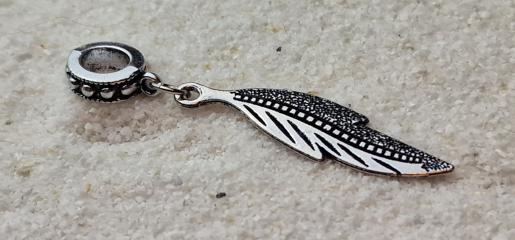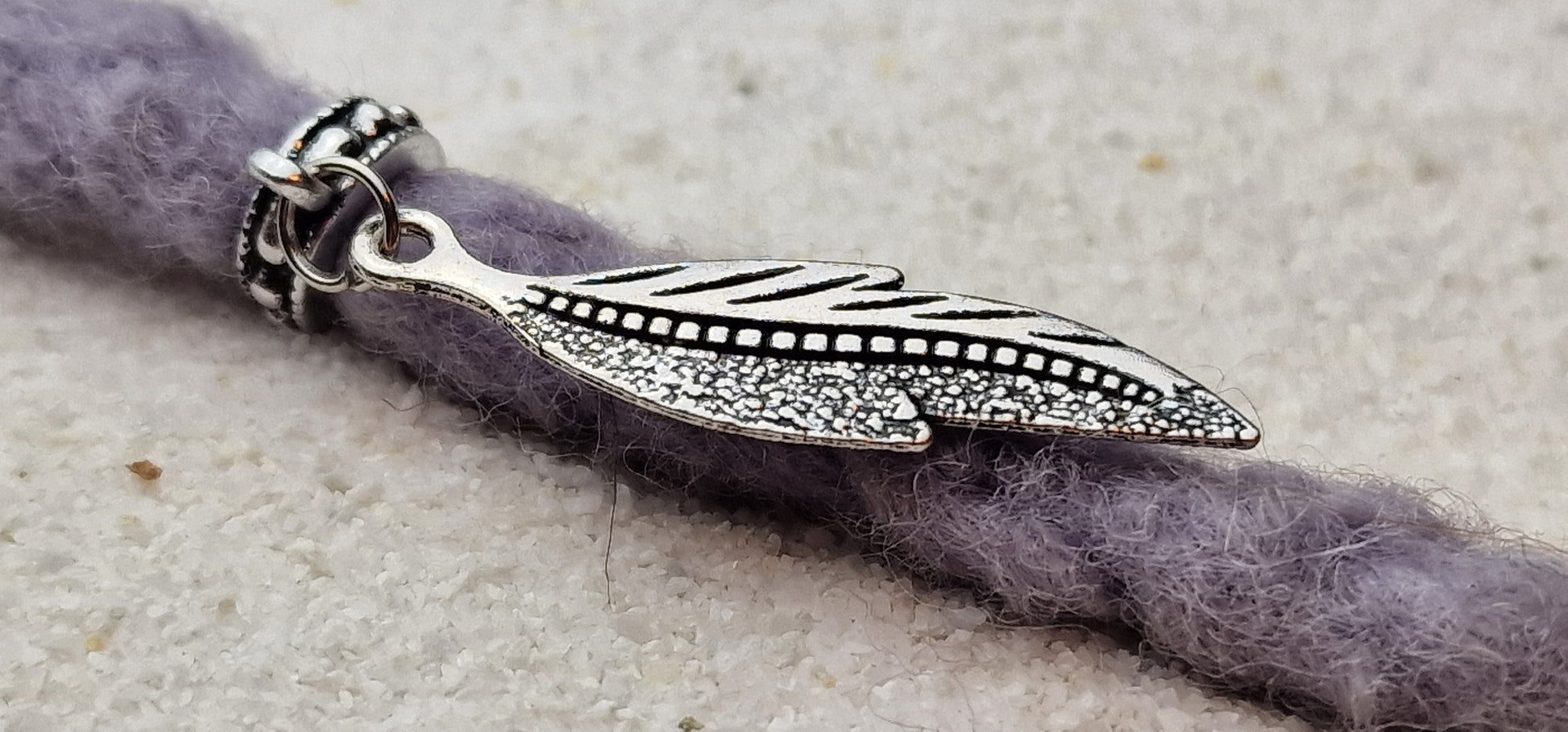 Die geschwungene Form erinnert an ein Blatt oder eine stilisierte Feder und ist mit einem filigranen Muster verziert. Bei diesem Anhänger sind sowohl Vorder- als auch Rückseite ausgestaltet, daher ist er wendbar und die Dreadperle kann in beide Richtungen aufgezogen werden;